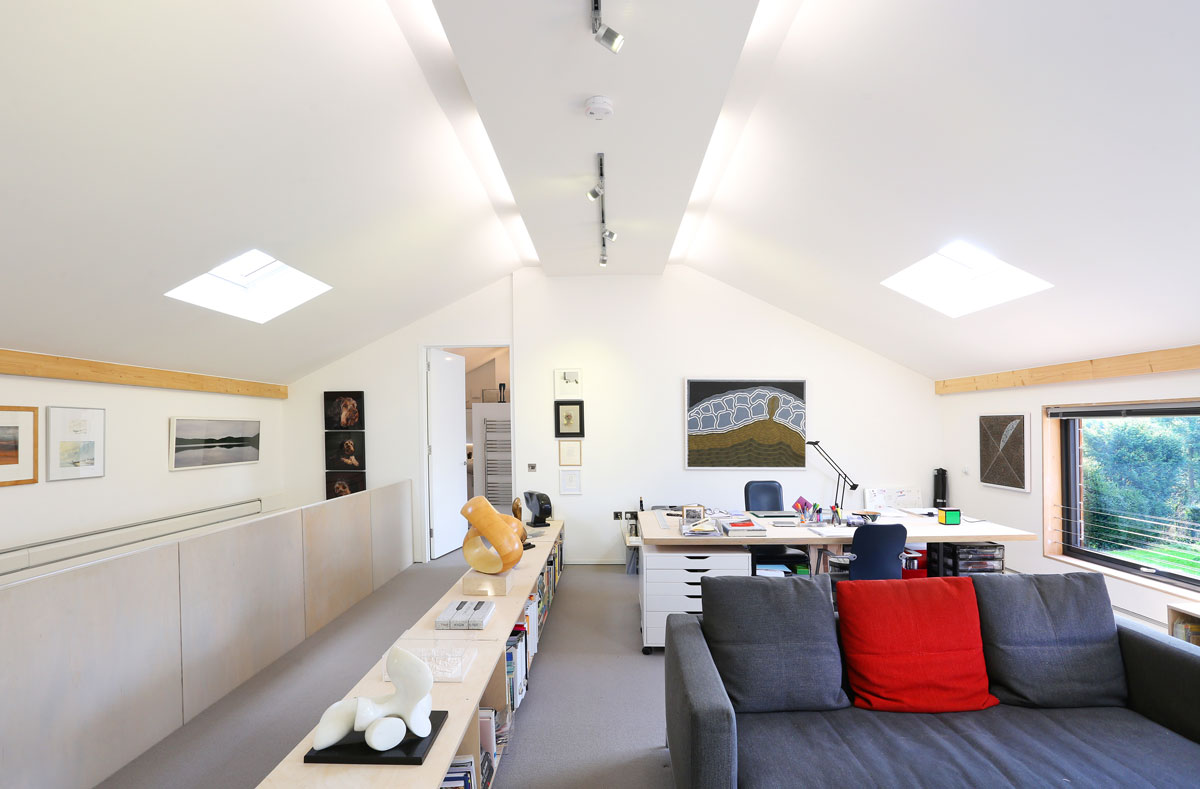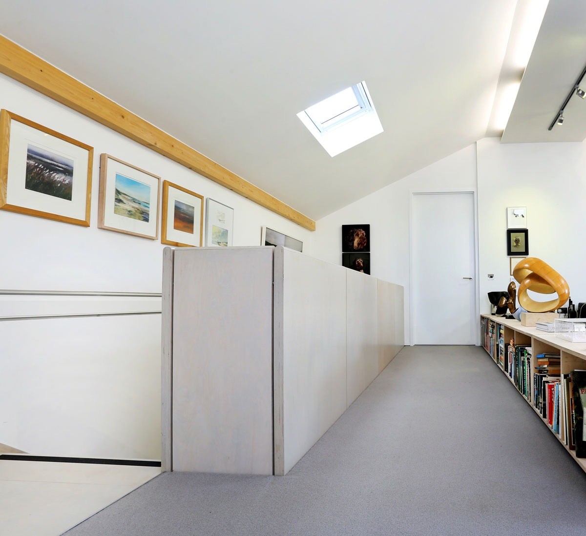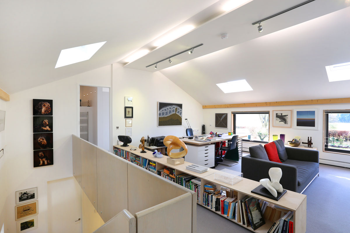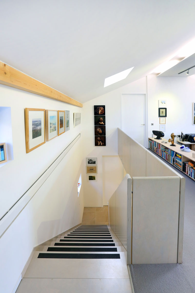 Underfloor heating in the ground floor slab enabled sleek skirting radiators to be used at first floor. The client’s son-in-law worked seamlessly with the team on the electrical installation. N&P Joinery were commissioned to build and install a unique staircase leading up to the airy day/work studio between the bedroom suites.