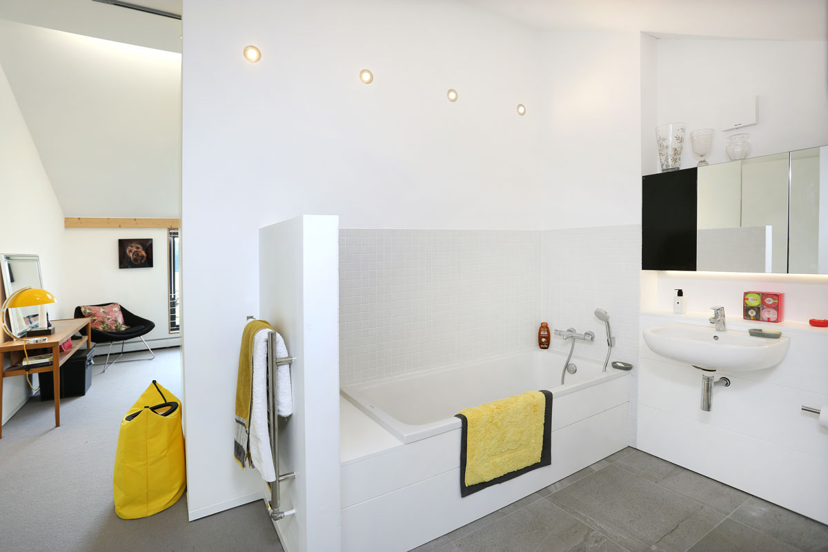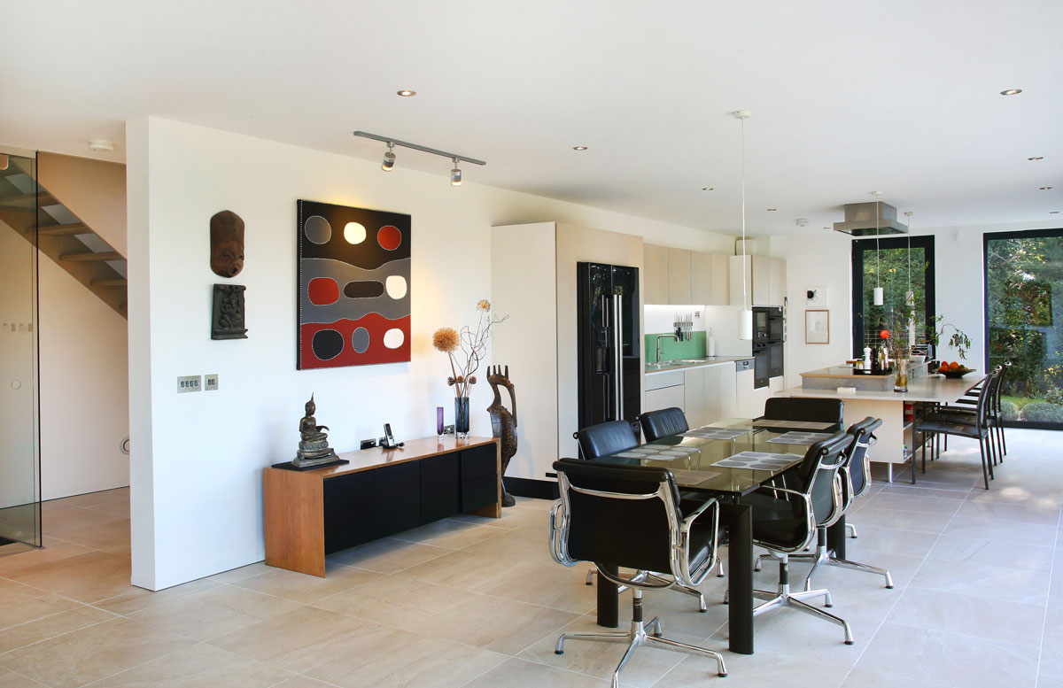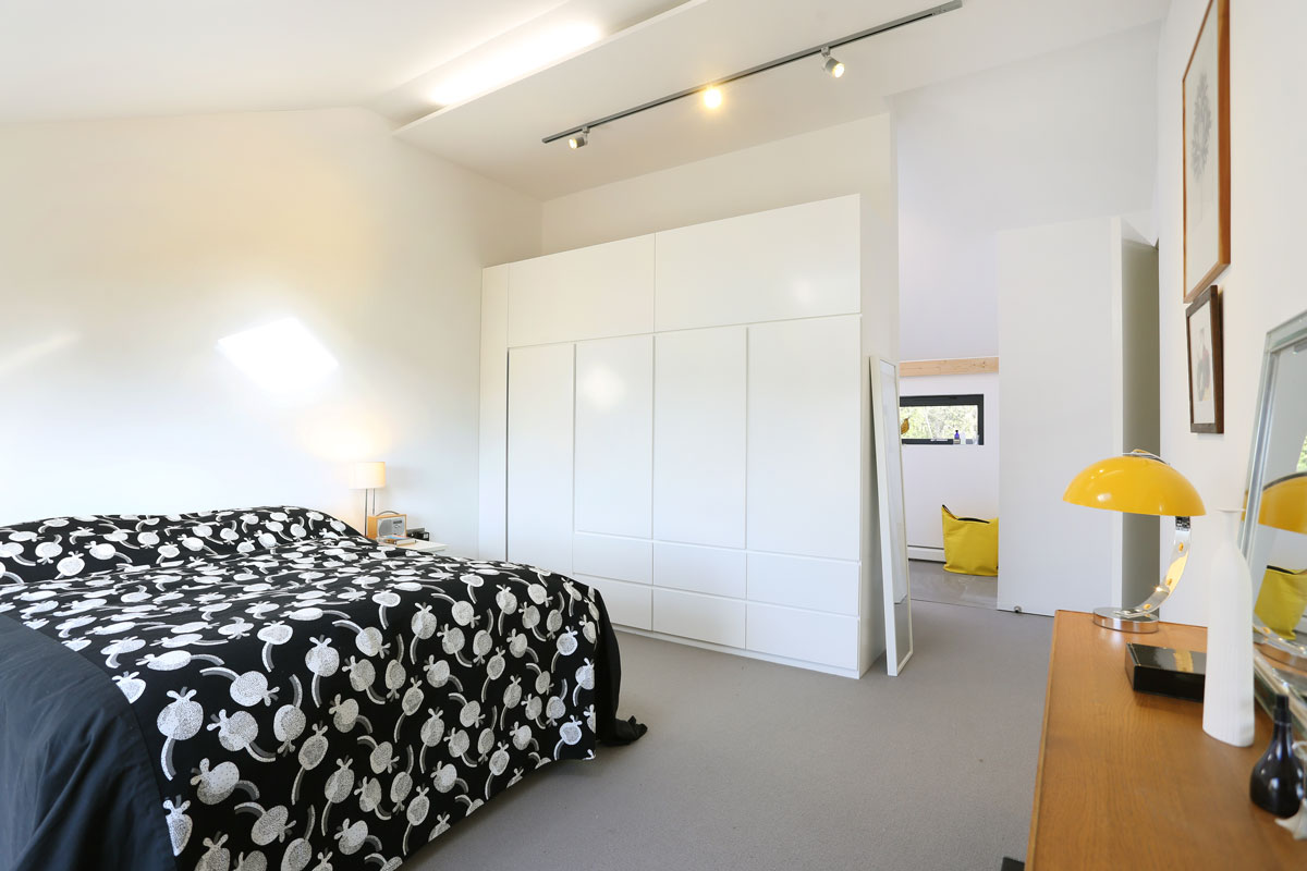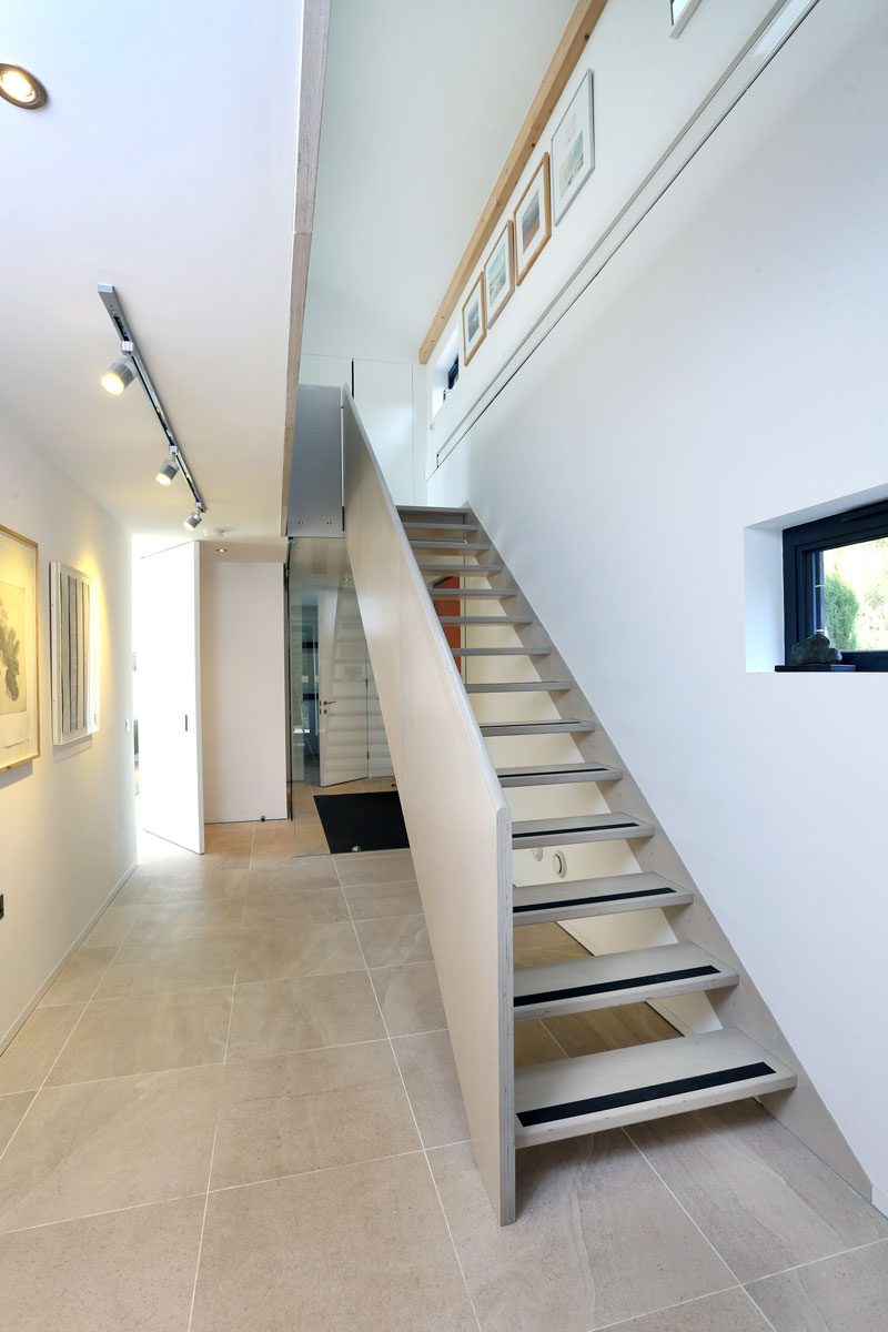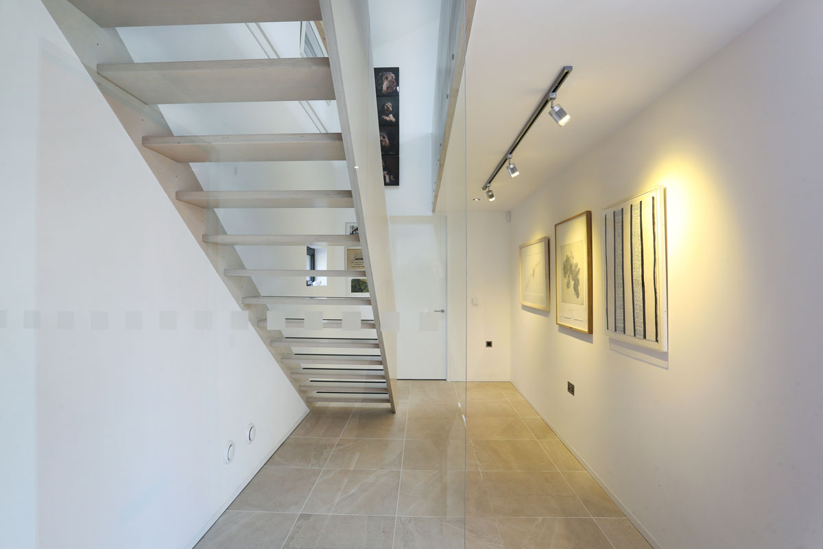 Underfloor heating in the ground floor slab enabled sleek skirting radiators to be used at first floor. The client’s son-in-law worked seamlessly with the team on the electrical installation. N&P Joinery were commissioned to build and install a unique staircase leading up to the airy day/work studio between the bedroom suites.