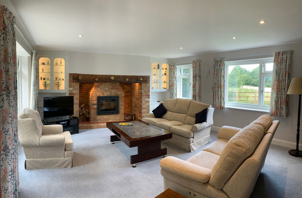 Relocation of all new incoming services was undertaken. Three phase power was installed and overhead services were refitted under the driveway. This meant unsightly poles could be removed and the previous regular power cuts, due low level trees, could be avoided. An Air Source Heat Pump was installed.