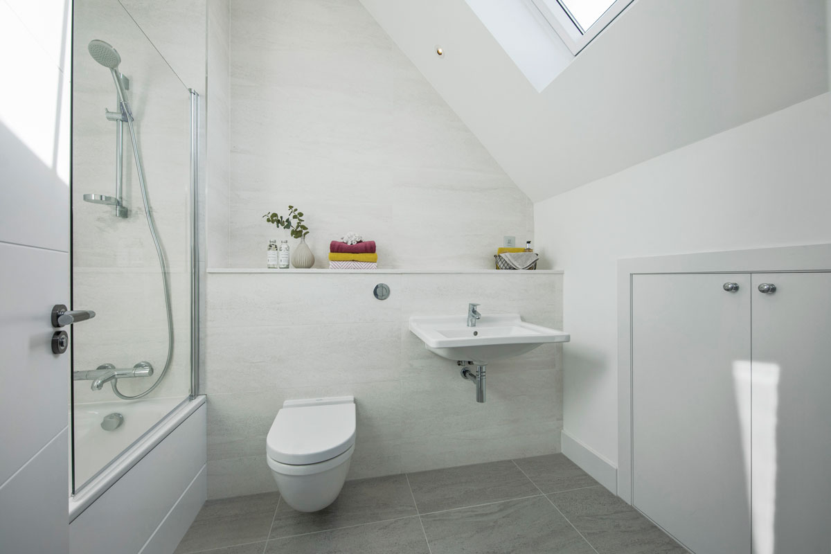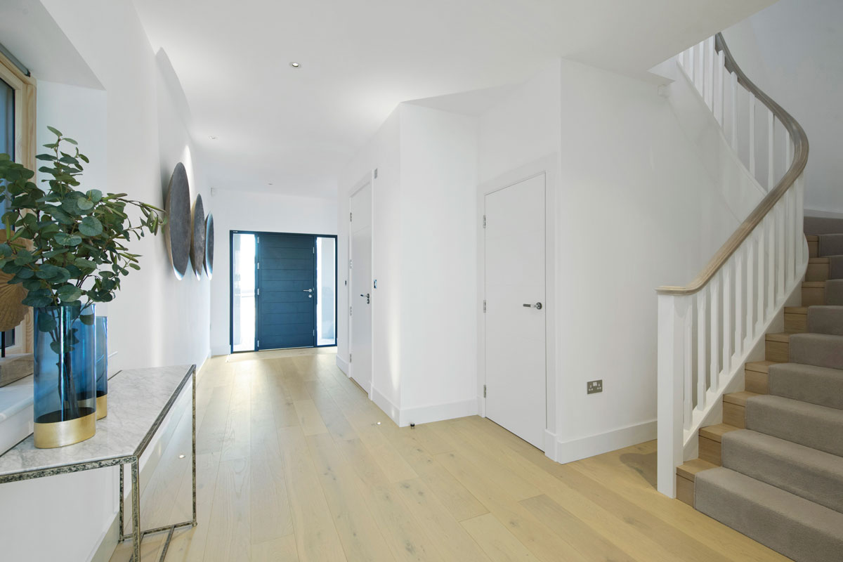 Our management team managed the smooth transition of the trades with the only access to the site being from the road. Our M & E trades worked with Macleods Development to come up with a simple yet comprehensive package. Wet underfloor heating was installed to the ground floors and radiators to the top two floors to control the personalised heat curves to the bedrooms. Rako lighting with its varied scenes was fitted to all communal areas. Jaques Construction recommends the ply lining of timber frame buildings internally which enhances the acoustics and makes simple the fixing of furnishings. Photovoltaic panels provide the finishing detail on what will be energy efficient houses that will be very economical to run.