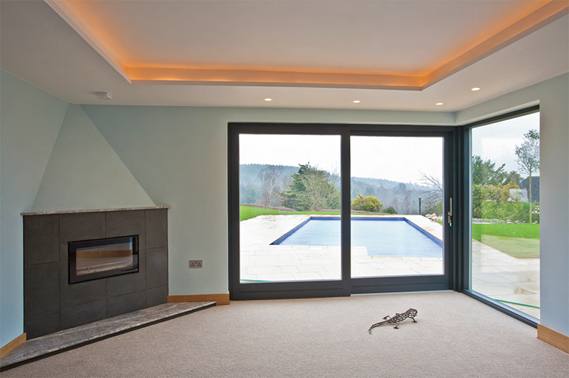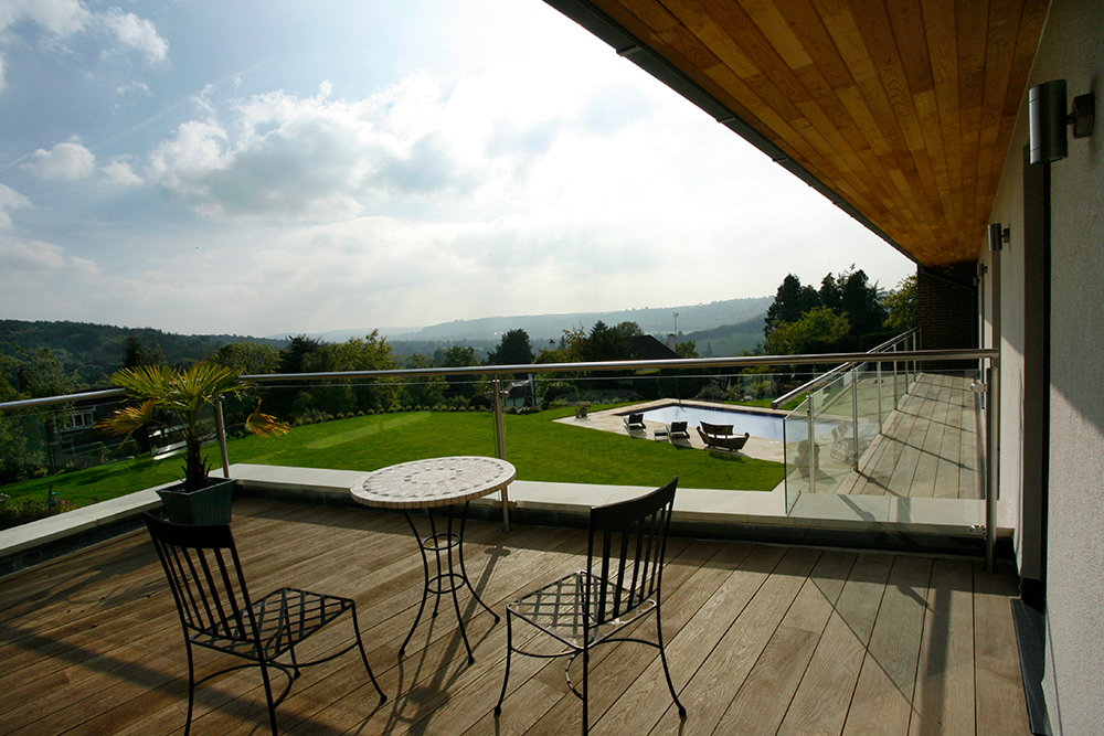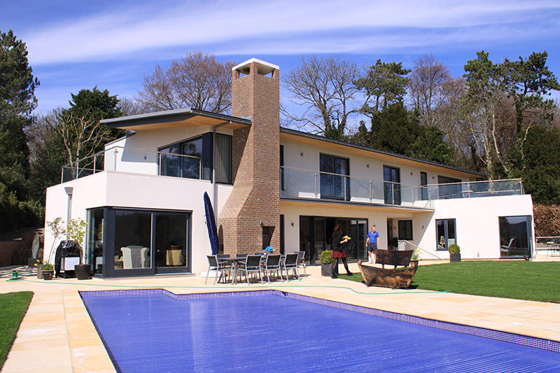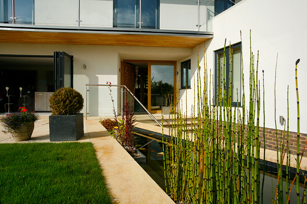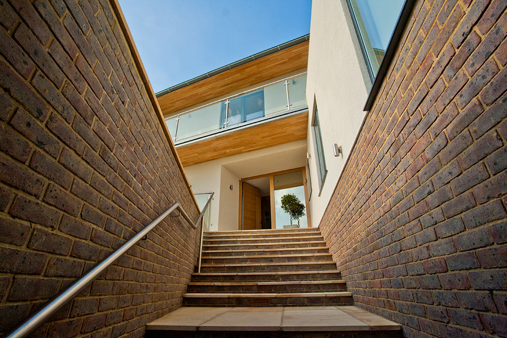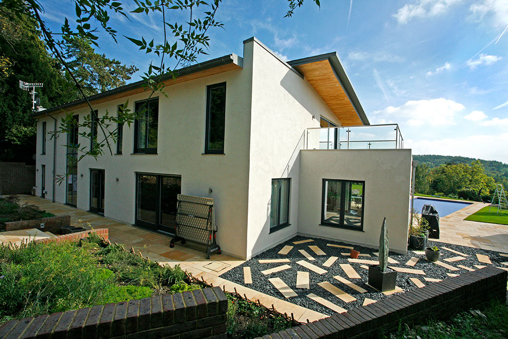 Following demolition, the site levels were substantially altered. This was not only to create the site for the house but also a lower level basement, a garage, and a level garden with a swimming pool. All the benefits of a chalky soil, including good drainage, stability, and compactness, were utilised during the process. Powder coated aluminium windows, through colour acrylic render and a zinc roof all help to protect the dwelling in its elevated south facing position.